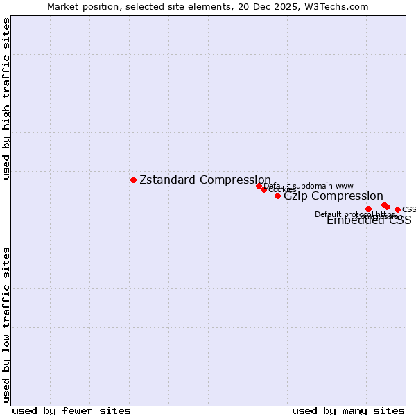 TechnologiesContent ManagementServer-side Languages Client-side Languages JavaScript Libraries CSS Frameworks Web Servers Web Panels Operating Systems Web Hosting Data Centers Reverse Proxies DNS Servers Email Servers SSL Certificate Authorities Content Delivery Traffic Analysis Tools Advertising Networks Tag Managers Social Widgets Site Elements Structured Data Markup Languages Character Encodings Image File Formats Top Level Domains Server Locations Content Languages | Technologies > Site Elements > Technology usage comparison Comparison of the usage statistics of Embedded CSS vs. Gzip Compression vs. Zstandard Compression for websitesThis report shows the usage statistics of Embedded CSS vs. Gzip Compression vs. Zstandard Compression as site element on the web. See technologies overview for explanations on the methodologies used in the surveys. Our reports are updated daily. UsageThis diagram shows the percentages of websites using the selected technologies. How to read the diagram: