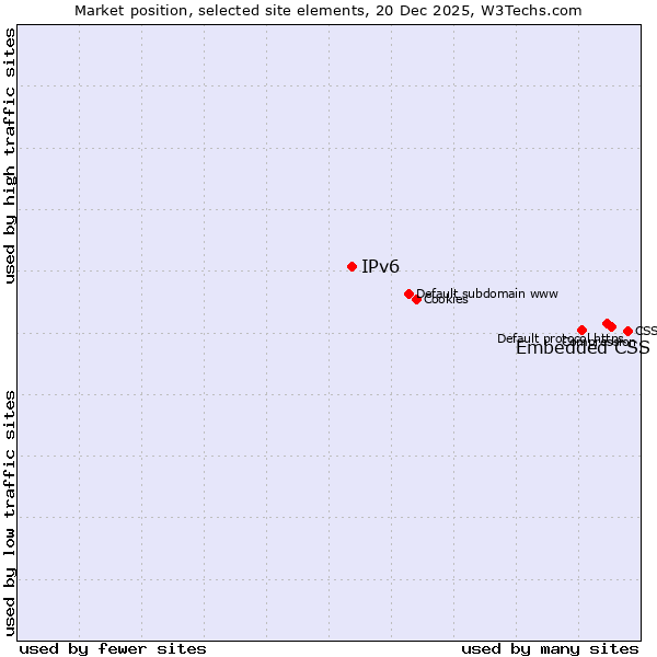 TechnologiesContent ManagementServer-side Languages Client-side Languages JavaScript Libraries CSS Frameworks Web Servers Web Panels Operating Systems Web Hosting Data Centers Reverse Proxies DNS Servers Email Servers SSL Certificate Authorities Content Delivery Traffic Analysis Tools Advertising Networks Tag Managers Social Widgets Site Elements Structured Data Markup Languages Character Encodings Image File Formats Top Level Domains Server Locations Content Languages ComparisonCompare with other | Technologies > Site Elements > Technology usage comparison Comparison of the usage statistics of Embedded CSS vs. IPv6 for websitesThis report shows the usage statistics of Embedded CSS vs. IPv6 as site element on the web. See technologies overview for explanations on the methodologies used in the surveys. Our reports are updated daily. UsageThis diagram shows the percentages of websites using the selected technologies. How to read the diagram: