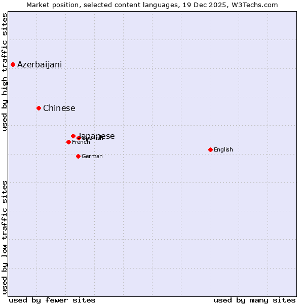 TechnologiesContent ManagementServer-side Languages Client-side Languages JavaScript Libraries CSS Frameworks Web Servers Web Panels Operating Systems Web Hosting Data Centers Reverse Proxies DNS Servers Email Servers SSL Certificate Authorities Content Delivery Traffic Analysis Tools Advertising Networks Tag Managers Social Widgets Site Elements Structured Data Markup Languages Character Encodings Image File Formats Top Level Domains Server Locations Content Languages | Technologies > Content Languages > Technology usage comparison Comparison of the usage statistics of Japanese vs. Chinese vs. Azerbaijani for websitesThis report shows the usage statistics of Japanese vs. Chinese vs. Azerbaijani as content language on the web. See technologies overview for explanations on the methodologies used in the surveys. Our reports are updated daily. UsageThis diagram shows the percentages of websites using the selected technologies. How to read the diagram: