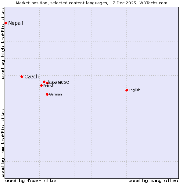 TechnologiesContent ManagementServer-side Languages Client-side Languages JavaScript Libraries CSS Frameworks Web Servers Web Panels Operating Systems Web Hosting Data Centers Reverse Proxies DNS Servers Email Servers SSL Certificate Authorities Content Delivery Traffic Analysis Tools Advertising Networks Tag Managers Social Widgets Site Elements Structured Data Markup Languages Character Encodings Image File Formats Top Level Domains Server Locations Content Languages | Technologies > Content Languages > Technology usage comparison Comparison of the usage statistics of Japanese vs. Czech vs. Nepali for websitesThis report shows the usage statistics of Japanese vs. Czech vs. Nepali as content language on the web. See technologies overview for explanations on the methodologies used in the surveys. Our reports are updated daily. UsageThis diagram shows the percentages of websites using the selected technologies. How to read the diagram: