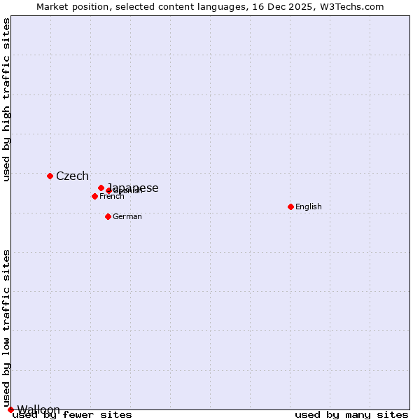 TechnologiesContent ManagementServer-side Languages Client-side Languages JavaScript Libraries CSS Frameworks Web Servers Web Panels Operating Systems Web Hosting Data Centers Reverse Proxies DNS Servers Email Servers SSL Certificate Authorities Content Delivery Traffic Analysis Tools Advertising Networks Tag Managers Social Widgets Site Elements Structured Data Markup Languages Character Encodings Image File Formats Top Level Domains Server Locations Content Languages | Technologies > Content Languages > Technology usage comparison Comparison of the usage statistics of Japanese vs. Czech vs. Walloon for websitesThis report shows the usage statistics of Japanese vs. Czech vs. Walloon as content language on the web. See technologies overview for explanations on the methodologies used in the surveys. Our reports are updated daily. UsageThis diagram shows the percentages of websites using the selected technologies. How to read the diagram: