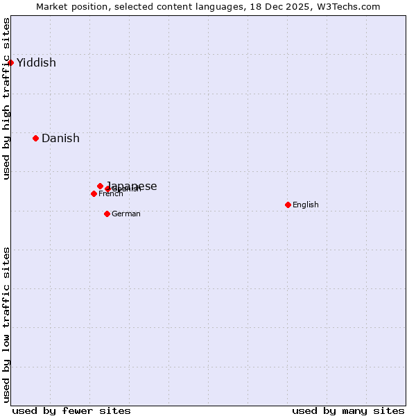TechnologiesContent ManagementServer-side Languages Client-side Languages JavaScript Libraries CSS Frameworks Web Servers Web Panels Operating Systems Web Hosting Data Centers Reverse Proxies DNS Servers Email Servers SSL Certificate Authorities Content Delivery Traffic Analysis Tools Advertising Networks Tag Managers Social Widgets Site Elements Structured Data Markup Languages Character Encodings Image File Formats Top Level Domains Server Locations Content Languages | Technologies > Content Languages > Technology usage comparison Comparison of the usage statistics of Japanese vs. Danish vs. Yiddish for websitesThis report shows the usage statistics of Japanese vs. Danish vs. Yiddish as content language on the web. See technologies overview for explanations on the methodologies used in the surveys. Our reports are updated daily. UsageThis diagram shows the percentages of websites using the selected technologies. How to read the diagram: