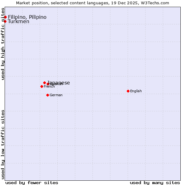 TechnologiesContent ManagementServer-side Languages Client-side Languages JavaScript Libraries CSS Frameworks Web Servers Web Panels Operating Systems Web Hosting Data Centers Reverse Proxies DNS Servers Email Servers SSL Certificate Authorities Content Delivery Traffic Analysis Tools Advertising Networks Tag Managers Social Widgets Site Elements Structured Data Markup Languages Character Encodings Image File Formats Top Level Domains Server Locations Content Languages | Technologies > Content Languages > Technology usage comparison Comparison of the usage statistics of Japanese vs. Filipino, Pilipino vs. Turkmen for websitesThis report shows the usage statistics of Japanese vs. Filipino, Pilipino vs. Turkmen as content language on the web. See technologies overview for explanations on the methodologies used in the surveys. Our reports are updated daily. UsageThis diagram shows the percentages of websites using the selected technologies. How to read the diagram: