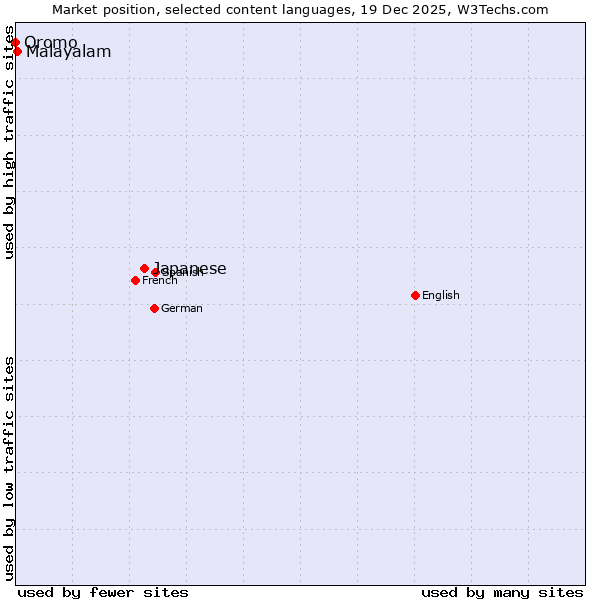 TechnologiesContent ManagementServer-side Languages Client-side Languages JavaScript Libraries CSS Frameworks Web Servers Web Panels Operating Systems Web Hosting Data Centers Reverse Proxies DNS Servers Email Servers SSL Certificate Authorities Content Delivery Traffic Analysis Tools Advertising Networks Tag Managers Social Widgets Site Elements Structured Data Markup Languages Character Encodings Image File Formats Top Level Domains Server Locations Content Languages | Technologies > Content Languages > Technology usage comparison Comparison of the usage statistics of Japanese vs. Malayalam vs. Oromo for websitesThis report shows the usage statistics of Japanese vs. Malayalam vs. Oromo as content language on the web. See technologies overview for explanations on the methodologies used in the surveys. Our reports are updated daily. UsageThis diagram shows the percentages of websites using the selected technologies. How to read the diagram:
