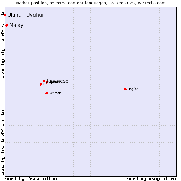 TechnologiesContent ManagementServer-side Languages Client-side Languages JavaScript Libraries CSS Frameworks Web Servers Web Panels Operating Systems Web Hosting Data Centers Reverse Proxies DNS Servers Email Servers SSL Certificate Authorities Content Delivery Traffic Analysis Tools Advertising Networks Tag Managers Social Widgets Site Elements Structured Data Markup Languages Character Encodings Image File Formats Top Level Domains Server Locations Content Languages | Technologies > Content Languages > Technology usage comparison Comparison of the usage statistics of Japanese vs. Malay vs. Uighur, Uyghur for websitesThis report shows the usage statistics of Japanese vs. Malay vs. Uighur, Uyghur as content language on the web. See technologies overview for explanations on the methodologies used in the surveys. Our reports are updated daily. UsageThis diagram shows the percentages of websites using the selected technologies. How to read the diagram: