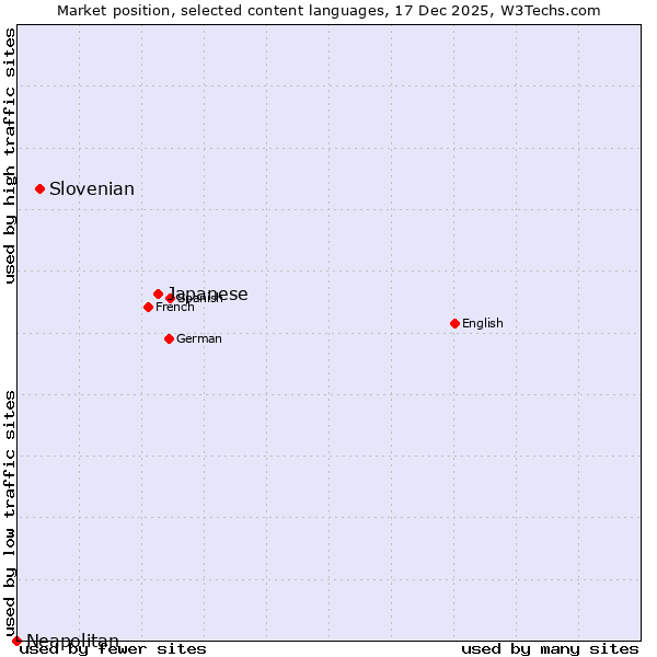 TechnologiesContent ManagementServer-side Languages Client-side Languages JavaScript Libraries CSS Frameworks Web Servers Web Panels Operating Systems Web Hosting Data Centers Reverse Proxies DNS Servers Email Servers SSL Certificate Authorities Content Delivery Traffic Analysis Tools Advertising Networks Tag Managers Social Widgets Site Elements Structured Data Markup Languages Character Encodings Image File Formats Top Level Domains Server Locations Content Languages | Technologies > Content Languages > Technology usage comparison Comparison of the usage statistics of Japanese vs. Slovenian vs. Neapolitan for websitesThis report shows the usage statistics of Japanese vs. Slovenian vs. Neapolitan as content language on the web. See technologies overview for explanations on the methodologies used in the surveys. Our reports are updated daily. UsageThis diagram shows the percentages of websites using the selected technologies. How to read the diagram: