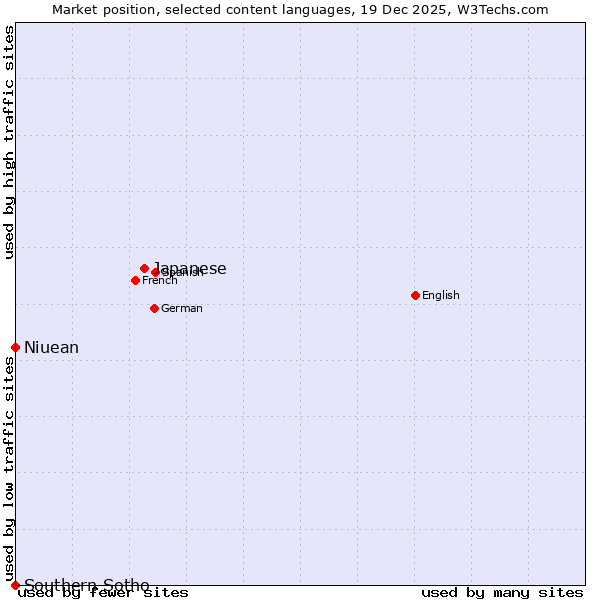 TechnologiesContent ManagementServer-side Languages Client-side Languages JavaScript Libraries CSS Frameworks Web Servers Web Panels Operating Systems Web Hosting Data Centers Reverse Proxies DNS Servers Email Servers SSL Certificate Authorities Content Delivery Traffic Analysis Tools Advertising Networks Tag Managers Social Widgets Site Elements Structured Data Markup Languages Character Encodings Image File Formats Top Level Domains Server Locations Content Languages | Technologies > Content Languages > Technology usage comparison Comparison of the usage statistics of Japanese vs. Niuean vs. Southern Sotho for websitesThis report shows the usage statistics of Japanese vs. Niuean vs. Southern Sotho as content language on the web. See technologies overview for explanations on the methodologies used in the surveys. Our reports are updated daily. UsageThis diagram shows the percentages of websites using the selected technologies. How to read the diagram: