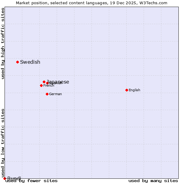 TechnologiesContent ManagementServer-side Languages Client-side Languages JavaScript Libraries CSS Frameworks Web Servers Web Panels Operating Systems Web Hosting Data Centers Reverse Proxies DNS Servers Email Servers SSL Certificate Authorities Content Delivery Traffic Analysis Tools Advertising Networks Tag Managers Social Widgets Site Elements Structured Data Markup Languages Character Encodings Image File Formats Top Level Domains Server Locations Content Languages | Technologies > Content Languages > Technology usage comparison Comparison of the usage statistics of Japanese vs. Swedish vs. Rundi for websitesThis report shows the usage statistics of Japanese vs. Swedish vs. Rundi as content language on the web. See technologies overview for explanations on the methodologies used in the surveys. Our reports are updated daily. UsageThis diagram shows the percentages of websites using the selected technologies. How to read the diagram: