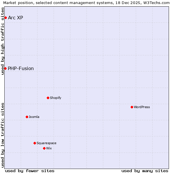 TechnologiesContent ManagementServer-side Languages Client-side Languages JavaScript Libraries CSS Frameworks Web Servers Web Panels Operating Systems Web Hosting Data Centers Reverse Proxies DNS Servers Email Servers SSL Certificate Authorities Content Delivery Traffic Analysis Tools Advertising Networks Tag Managers Social Widgets Site Elements Structured Data Markup Languages Character Encodings Image File Formats Top Level Domains Server Locations Content Languages ComparisonCompare with other | Technologies > Content Management > Technology usage comparison Comparison of the usage statistics of Arc XP vs. PHP-Fusion for websitesThis report shows the usage statistics of Arc XP vs. PHP-Fusion as content management system on the web. See technologies overview for explanations on the methodologies used in the surveys. Our reports are updated daily. Usage and market shareThis diagram shows the percentages of websites using the selected technologies. How to read the diagram: