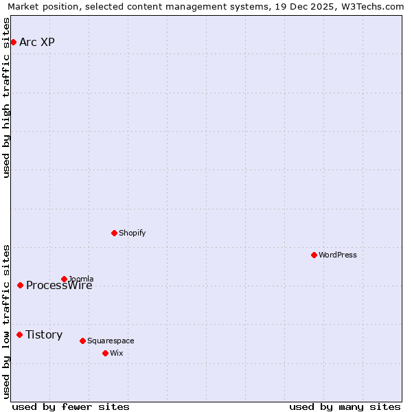 TechnologiesContent ManagementServer-side Languages Client-side Languages JavaScript Libraries CSS Frameworks Web Servers Web Panels Operating Systems Web Hosting Data Centers Reverse Proxies DNS Servers Email Servers SSL Certificate Authorities Content Delivery Traffic Analysis Tools Advertising Networks Tag Managers Social Widgets Site Elements Structured Data Markup Languages Character Encodings Image File Formats Top Level Domains Server Locations Content Languages | Technologies > Content Management > Technology usage comparison Comparison of the usage statistics of ProcessWire vs. Tistory vs. Arc XP for websitesThis report shows the usage statistics of ProcessWire vs. Tistory vs. Arc XP as content management system on the web. See technologies overview for explanations on the methodologies used in the surveys. Our reports are updated daily. Usage and market shareThis diagram shows the percentages of websites using the selected technologies. How to read the diagram: