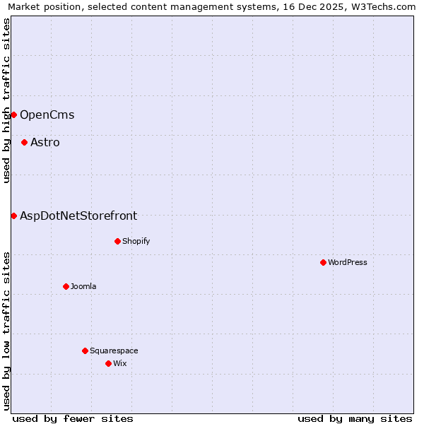 TechnologiesContent ManagementServer-side Languages Client-side Languages JavaScript Libraries CSS Frameworks Web Servers Web Panels Operating Systems Web Hosting Data Centers Reverse Proxies DNS Servers Email Servers SSL Certificate Authorities Content Delivery Traffic Analysis Tools Advertising Networks Tag Managers Social Widgets Site Elements Structured Data Markup Languages Character Encodings Image File Formats Top Level Domains Server Locations Content Languages | Technologies > Content Management > Technology usage comparison Comparison of the usage statistics of Astro vs. AspDotNetStorefront vs. OpenCms for websitesThis report shows the usage statistics of Astro vs. AspDotNetStorefront vs. OpenCms as content management system on the web. See technologies overview for explanations on the methodologies used in the surveys. Our reports are updated daily. Usage and market shareThis diagram shows the percentages of websites using the selected technologies. How to read the diagram: