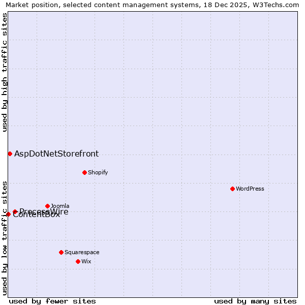 TechnologiesContent ManagementServer-side Languages Client-side Languages JavaScript Libraries CSS Frameworks Web Servers Web Panels Operating Systems Web Hosting Data Centers Reverse Proxies DNS Servers Email Servers SSL Certificate Authorities Content Delivery Traffic Analysis Tools Advertising Networks Tag Managers Social Widgets Site Elements Structured Data Markup Languages Character Encodings Image File Formats Top Level Domains Server Locations Content Languages | Technologies > Content Management > Technology usage comparison Comparison of the usage statistics of ProcessWire vs. AspDotNetStorefront vs. ContentBox for websitesThis report shows the usage statistics of ProcessWire vs. AspDotNetStorefront vs. ContentBox as content management system on the web. See technologies overview for explanations on the methodologies used in the surveys. Our reports are updated daily. Usage and market shareThis diagram shows the percentages of websites using the selected technologies. How to read the diagram: