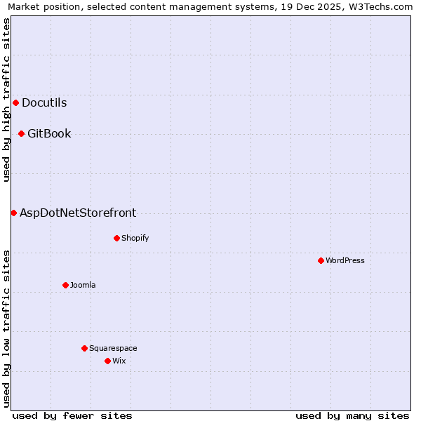TechnologiesContent ManagementServer-side Languages Client-side Languages JavaScript Libraries CSS Frameworks Web Servers Web Panels Operating Systems Web Hosting Data Centers Reverse Proxies DNS Servers Email Servers SSL Certificate Authorities Content Delivery Traffic Analysis Tools Advertising Networks Tag Managers Social Widgets Site Elements Structured Data Markup Languages Character Encodings Image File Formats Top Level Domains Server Locations Content Languages | Technologies > Content Management > Technology usage comparison Comparison of the usage statistics of GitBook vs. Docutils vs. AspDotNetStorefront for websitesThis report shows the usage statistics of GitBook vs. Docutils vs. AspDotNetStorefront as content management system on the web. See technologies overview for explanations on the methodologies used in the surveys. Our reports are updated daily. Usage and market shareThis diagram shows the percentages of websites using the selected technologies. How to read the diagram: