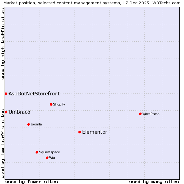 TechnologiesContent ManagementServer-side Languages Client-side Languages JavaScript Libraries CSS Frameworks Web Servers Web Panels Operating Systems Web Hosting Data Centers Reverse Proxies DNS Servers Email Servers SSL Certificate Authorities Content Delivery Traffic Analysis Tools Advertising Networks Tag Managers Social Widgets Site Elements Structured Data Markup Languages Character Encodings Image File Formats Top Level Domains Server Locations Content Languages | Technologies > Content Management > Technology usage comparison Comparison of the usage statistics of Elementor vs. Umbraco vs. AspDotNetStorefront for websitesThis report shows the usage statistics of Elementor vs. Umbraco vs. AspDotNetStorefront as content management system on the web. See technologies overview for explanations on the methodologies used in the surveys. Our reports are updated daily. Usage and market shareThis diagram shows the percentages of websites using the selected technologies. How to read the diagram: