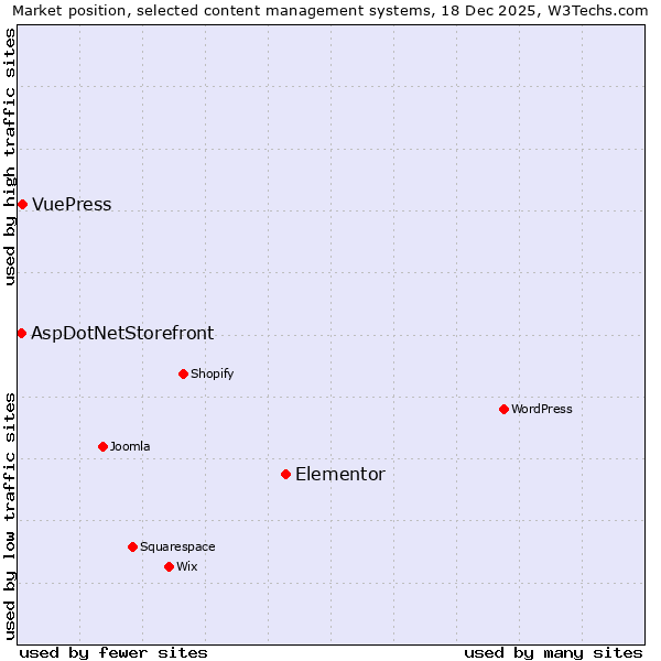 TechnologiesContent ManagementServer-side Languages Client-side Languages JavaScript Libraries CSS Frameworks Web Servers Web Panels Operating Systems Web Hosting Data Centers Reverse Proxies DNS Servers Email Servers SSL Certificate Authorities Content Delivery Traffic Analysis Tools Advertising Networks Tag Managers Social Widgets Site Elements Structured Data Markup Languages Character Encodings Image File Formats Top Level Domains Server Locations Content Languages | Technologies > Content Management > Technology usage comparison Comparison of the usage statistics of Elementor vs. VuePress vs. AspDotNetStorefront for websitesThis report shows the usage statistics of Elementor vs. VuePress vs. AspDotNetStorefront as content management system on the web. See technologies overview for explanations on the methodologies used in the surveys. Our reports are updated daily. Usage and market shareThis diagram shows the percentages of websites using the selected technologies. How to read the diagram: