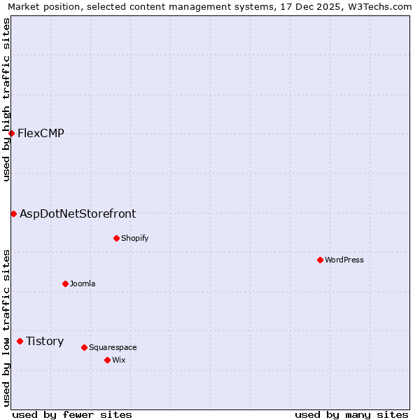 TechnologiesContent ManagementServer-side Languages Client-side Languages JavaScript Libraries CSS Frameworks Web Servers Web Panels Operating Systems Web Hosting Data Centers Reverse Proxies DNS Servers Email Servers SSL Certificate Authorities Content Delivery Traffic Analysis Tools Advertising Networks Tag Managers Social Widgets Site Elements Structured Data Markup Languages Character Encodings Image File Formats Top Level Domains Server Locations Content Languages | Technologies > Content Management > Technology usage comparison Comparison of the usage statistics of Tistory vs. AspDotNetStorefront vs. FlexCMP for websitesThis report shows the usage statistics of Tistory vs. AspDotNetStorefront vs. FlexCMP as content management system on the web. See technologies overview for explanations on the methodologies used in the surveys. Our reports are updated daily. Usage and market shareThis diagram shows the percentages of websites using the selected technologies. How to read the diagram: