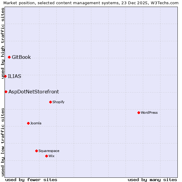 TechnologiesContent ManagementServer-side Languages Client-side Languages JavaScript Libraries CSS Frameworks Web Servers Web Panels Operating Systems Web Hosting Data Centers Reverse Proxies DNS Servers Email Servers SSL Certificate Authorities Content Delivery Traffic Analysis Tools Advertising Networks Tag Managers Social Widgets Site Elements Structured Data Markup Languages Character Encodings Image File Formats Top Level Domains Server Locations Content Languages | Technologies > Content Management > Technology usage comparison Comparison of the usage statistics of GitBook vs. AspDotNetStorefront vs. ILIAS for websitesThis report shows the usage statistics of GitBook vs. AspDotNetStorefront vs. ILIAS as content management system on the web. See technologies overview for explanations on the methodologies used in the surveys. Our reports are updated daily. Usage and market shareThis diagram shows the percentages of websites using the selected technologies. How to read the diagram: