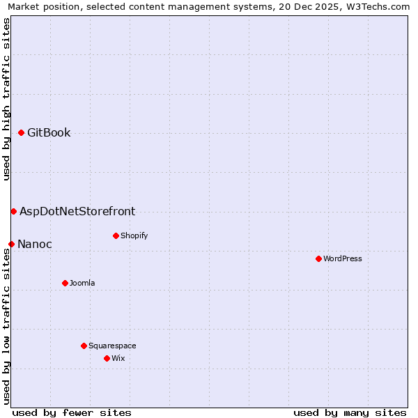 TechnologiesContent ManagementServer-side Languages Client-side Languages JavaScript Libraries CSS Frameworks Web Servers Web Panels Operating Systems Web Hosting Data Centers Reverse Proxies DNS Servers Email Servers SSL Certificate Authorities Content Delivery Traffic Analysis Tools Advertising Networks Tag Managers Social Widgets Site Elements Structured Data Markup Languages Character Encodings Image File Formats Top Level Domains Server Locations Content Languages | Technologies > Content Management > Technology usage comparison Comparison of the usage statistics of GitBook vs. AspDotNetStorefront vs. Nanoc for websitesThis report shows the usage statistics of GitBook vs. AspDotNetStorefront vs. Nanoc as content management system on the web. See technologies overview for explanations on the methodologies used in the surveys. Our reports are updated daily. Usage and market shareThis diagram shows the percentages of websites using the selected technologies. How to read the diagram:
