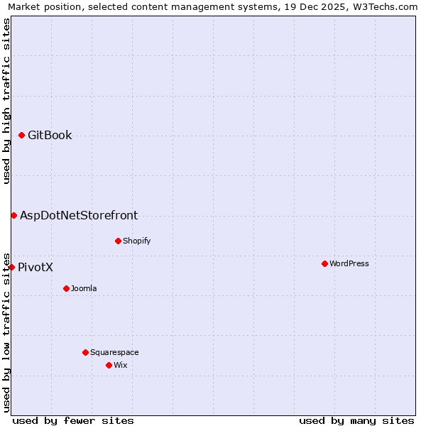 TechnologiesContent ManagementServer-side Languages Client-side Languages JavaScript Libraries CSS Frameworks Web Servers Web Panels Operating Systems Web Hosting Data Centers Reverse Proxies DNS Servers Email Servers SSL Certificate Authorities Content Delivery Traffic Analysis Tools Advertising Networks Tag Managers Social Widgets Site Elements Structured Data Markup Languages Character Encodings Image File Formats Top Level Domains Server Locations Content Languages | Technologies > Content Management > Technology usage comparison Comparison of the usage statistics of GitBook vs. AspDotNetStorefront vs. PivotX for websitesThis report shows the usage statistics of GitBook vs. AspDotNetStorefront vs. PivotX as content management system on the web. See technologies overview for explanations on the methodologies used in the surveys. Our reports are updated daily. Usage and market shareThis diagram shows the percentages of websites using the selected technologies. How to read the diagram: