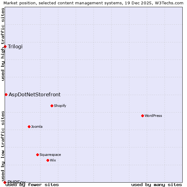 TechnologiesContent ManagementServer-side Languages Client-side Languages JavaScript Libraries CSS Frameworks Web Servers Web Panels Operating Systems Web Hosting Data Centers Reverse Proxies DNS Servers Email Servers SSL Certificate Authorities Content Delivery Traffic Analysis Tools Advertising Networks Tag Managers Social Widgets Site Elements Structured Data Markup Languages Character Encodings Image File Formats Top Level Domains Server Locations Content Languages | Technologies > Content Management > Technology usage comparison Comparison of the usage statistics of AspDotNetStorefront vs. Trilogi vs. PHPFox for websitesThis report shows the usage statistics of AspDotNetStorefront vs. Trilogi vs. PHPFox as content management system on the web. See technologies overview for explanations on the methodologies used in the surveys. Our reports are updated daily. Usage and market shareThis diagram shows the percentages of websites using the selected technologies. How to read the diagram: