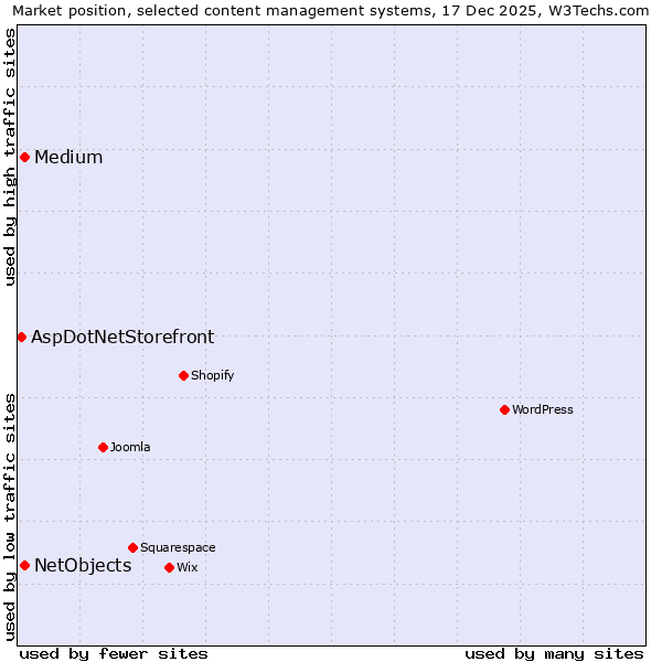 TechnologiesContent ManagementServer-side Languages Client-side Languages JavaScript Libraries CSS Frameworks Web Servers Web Panels Operating Systems Web Hosting Data Centers Reverse Proxies DNS Servers Email Servers SSL Certificate Authorities Content Delivery Traffic Analysis Tools Advertising Networks Tag Managers Social Widgets Site Elements Structured Data Markup Languages Character Encodings Image File Formats Top Level Domains Server Locations Content Languages | Technologies > Content Management > Technology usage comparison Comparison of the usage statistics of NetObjects vs. Medium vs. AspDotNetStorefront for websitesThis report shows the usage statistics of NetObjects vs. Medium vs. AspDotNetStorefront as content management system on the web. See technologies overview for explanations on the methodologies used in the surveys. Our reports are updated daily. Usage and market shareThis diagram shows the percentages of websites using the selected technologies. How to read the diagram: