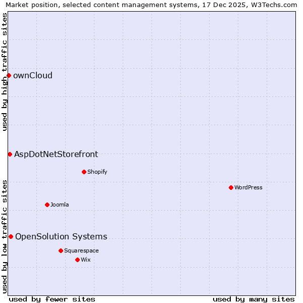 TechnologiesContent ManagementServer-side Languages Client-side Languages JavaScript Libraries CSS Frameworks Web Servers Web Panels Operating Systems Web Hosting Data Centers Reverse Proxies DNS Servers Email Servers SSL Certificate Authorities Content Delivery Traffic Analysis Tools Advertising Networks Tag Managers Social Widgets Site Elements Structured Data Markup Languages Character Encodings Image File Formats Top Level Domains Server Locations Content Languages | Technologies > Content Management > Technology usage comparison Comparison of the usage statistics of OpenSolution Systems vs. AspDotNetStorefront vs. ownCloud for websitesThis report shows the usage statistics of OpenSolution Systems vs. AspDotNetStorefront vs. ownCloud as content management system on the web. See technologies overview for explanations on the methodologies used in the surveys. Our reports are updated daily. Usage and market shareThis diagram shows the percentages of websites using the selected technologies. How to read the diagram: