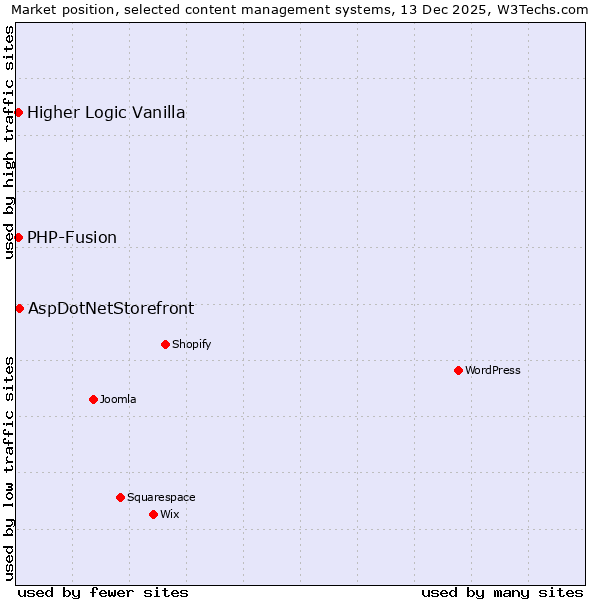 TechnologiesContent ManagementServer-side Languages Client-side Languages JavaScript Libraries CSS Frameworks Web Servers Web Panels Operating Systems Web Hosting Data Centers Reverse Proxies DNS Servers Email Servers SSL Certificate Authorities Content Delivery Traffic Analysis Tools Advertising Networks Tag Managers Social Widgets Site Elements Structured Data Markup Languages Character Encodings Image File Formats Top Level Domains Server Locations Content Languages | Technologies > Content Management > Technology usage comparison Comparison of the usage statistics of AspDotNetStorefront vs. PHP-Fusion vs. Higher Logic Vanilla for websitesThis report shows the usage statistics of AspDotNetStorefront vs. PHP-Fusion vs. Higher Logic Vanilla as content management system on the web. See technologies overview for explanations on the methodologies used in the surveys. Our reports are updated daily. Usage and market shareThis diagram shows the percentages of websites using the selected technologies. How to read the diagram: