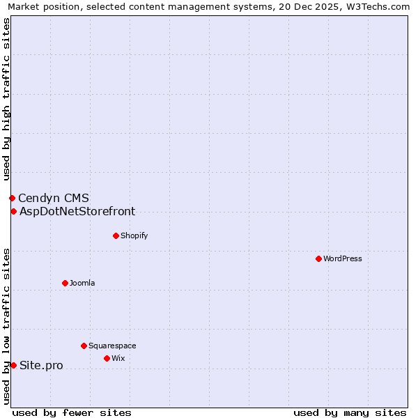 TechnologiesContent ManagementServer-side Languages Client-side Languages JavaScript Libraries CSS Frameworks Web Servers Web Panels Operating Systems Web Hosting Data Centers Reverse Proxies DNS Servers Email Servers SSL Certificate Authorities Content Delivery Traffic Analysis Tools Advertising Networks Tag Managers Social Widgets Site Elements Structured Data Markup Languages Character Encodings Image File Formats Top Level Domains Server Locations Content Languages | Technologies > Content Management > Technology usage comparison Comparison of the usage statistics of Site.pro vs. AspDotNetStorefront vs. Cendyn CMS for websitesThis report shows the usage statistics of Site.pro vs. AspDotNetStorefront vs. Cendyn CMS as content management system on the web. See technologies overview for explanations on the methodologies used in the surveys. Our reports are updated daily. Usage and market shareThis diagram shows the percentages of websites using the selected technologies. How to read the diagram: