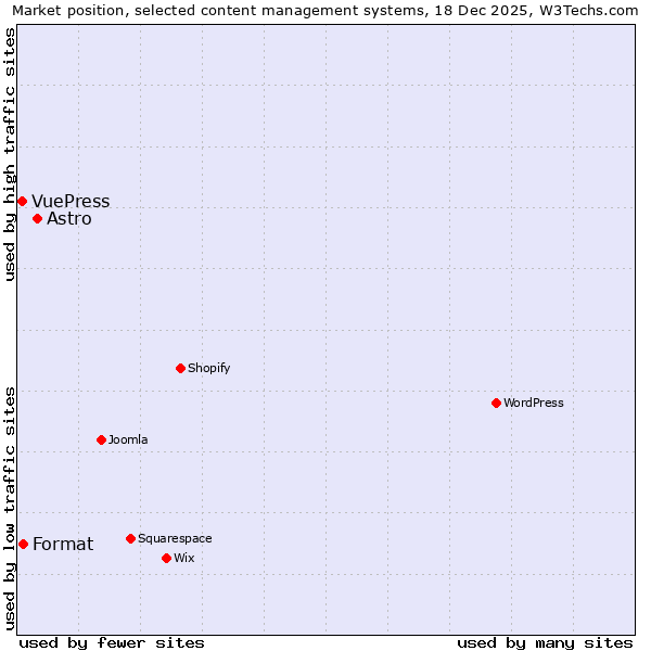 TechnologiesContent ManagementServer-side Languages Client-side Languages JavaScript Libraries CSS Frameworks Web Servers Web Panels Operating Systems Web Hosting Data Centers Reverse Proxies DNS Servers Email Servers SSL Certificate Authorities Content Delivery Traffic Analysis Tools Advertising Networks Tag Managers Social Widgets Site Elements Structured Data Markup Languages Character Encodings Image File Formats Top Level Domains Server Locations Content Languages | Technologies > Content Management > Technology usage comparison Comparison of the usage statistics of Astro vs. Format vs. VuePress for websitesThis report shows the usage statistics of Astro vs. Format vs. VuePress as content management system on the web. See technologies overview for explanations on the methodologies used in the surveys. Our reports are updated daily. Usage and market shareThis diagram shows the percentages of websites using the selected technologies. How to read the diagram: