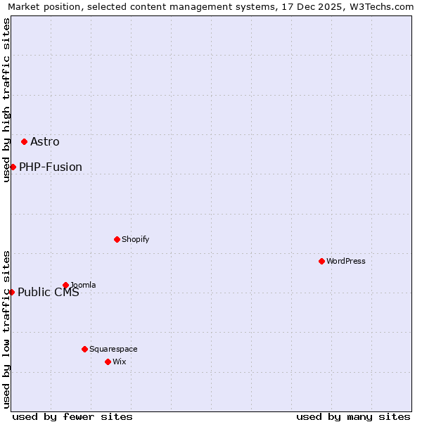 TechnologiesContent ManagementServer-side Languages Client-side Languages JavaScript Libraries CSS Frameworks Web Servers Web Panels Operating Systems Web Hosting Data Centers Reverse Proxies DNS Servers Email Servers SSL Certificate Authorities Content Delivery Traffic Analysis Tools Advertising Networks Tag Managers Social Widgets Site Elements Structured Data Markup Languages Character Encodings Image File Formats Top Level Domains Server Locations Content Languages | Technologies > Content Management > Technology usage comparison Comparison of the usage statistics of Astro vs. PHP-Fusion vs. Public CMS for websitesThis report shows the usage statistics of Astro vs. PHP-Fusion vs. Public CMS as content management system on the web. See technologies overview for explanations on the methodologies used in the surveys. Our reports are updated daily. Usage and market shareThis diagram shows the percentages of websites using the selected technologies. How to read the diagram: