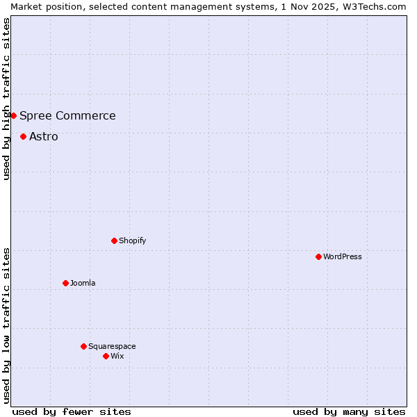 TechnologiesContent ManagementServer-side Languages Client-side Languages JavaScript Libraries CSS Frameworks Web Servers Web Panels Operating Systems Web Hosting Data Centers Reverse Proxies DNS Servers Email Servers SSL Certificate Authorities Content Delivery Traffic Analysis Tools Advertising Networks Tag Managers Social Widgets Site Elements Structured Data Markup Languages Character Encodings Image File Formats Top Level Domains Server Locations Content Languages ComparisonCompare with other | Technologies > Content Management > Technology usage comparison Comparison of the usage statistics of Astro vs. Spree Commerce for websitesThis report shows the usage statistics of Astro vs. Spree Commerce as content management system on the web. See technologies overview for explanations on the methodologies used in the surveys. Our reports are updated daily. Usage and market shareThis diagram shows the percentages of websites using the selected technologies. How to read the diagram:
