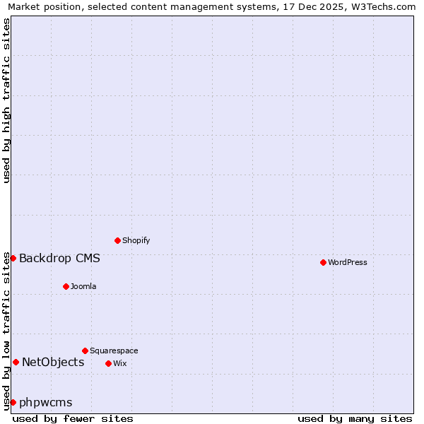 TechnologiesContent ManagementServer-side Languages Client-side Languages JavaScript Libraries CSS Frameworks Web Servers Web Panels Operating Systems Web Hosting Data Centers Reverse Proxies DNS Servers Email Servers SSL Certificate Authorities Content Delivery Traffic Analysis Tools Advertising Networks Tag Managers Social Widgets Site Elements Structured Data Markup Languages Character Encodings Image File Formats Top Level Domains Server Locations Content Languages | Technologies > Content Management > Technology usage comparison Comparison of the usage statistics of NetObjects vs. Backdrop CMS vs. phpwcms for websitesThis report shows the usage statistics of NetObjects vs. Backdrop CMS vs. phpwcms as content management system on the web. See technologies overview for explanations on the methodologies used in the surveys. Our reports are updated daily. Usage and market shareThis diagram shows the percentages of websites using the selected technologies. How to read the diagram: