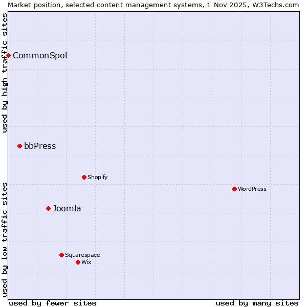 TechnologiesContent ManagementServer-side Languages Client-side Languages JavaScript Libraries CSS Frameworks Web Servers Web Panels Operating Systems Web Hosting Data Centers Reverse Proxies DNS Servers Email Servers SSL Certificate Authorities Content Delivery Traffic Analysis Tools Advertising Networks Tag Managers Social Widgets Site Elements Structured Data Markup Languages Character Encodings Image File Formats Top Level Domains Server Locations Content Languages | Technologies > Content Management > Technology usage comparison Comparison of the usage statistics of Joomla vs. bbPress vs. CommonSpot for websitesThis report shows the usage statistics of Joomla vs. bbPress vs. CommonSpot as content management system on the web. See technologies overview for explanations on the methodologies used in the surveys. Our reports are updated daily. Usage and market shareThis diagram shows the percentages of websites using the selected technologies. How to read the diagram: