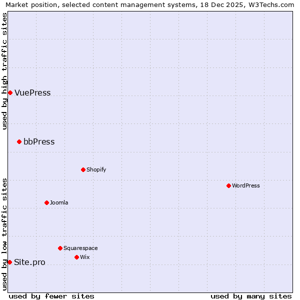 TechnologiesContent ManagementServer-side Languages Client-side Languages JavaScript Libraries CSS Frameworks Web Servers Web Panels Operating Systems Web Hosting Data Centers Reverse Proxies DNS Servers Email Servers SSL Certificate Authorities Content Delivery Traffic Analysis Tools Advertising Networks Tag Managers Social Widgets Site Elements Structured Data Markup Languages Character Encodings Image File Formats Top Level Domains Server Locations Content Languages | Technologies > Content Management > Technology usage comparison Comparison of the usage statistics of bbPress vs. VuePress vs. Site.pro for websitesThis report shows the usage statistics of bbPress vs. VuePress vs. Site.pro as content management system on the web. See technologies overview for explanations on the methodologies used in the surveys. Our reports are updated daily. Usage and market shareThis diagram shows the percentages of websites using the selected technologies. How to read the diagram: