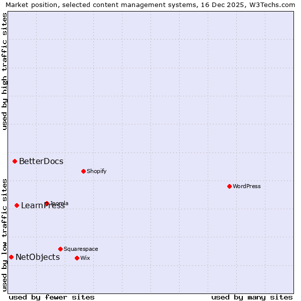 TechnologiesContent ManagementServer-side Languages Client-side Languages JavaScript Libraries CSS Frameworks Web Servers Web Panels Operating Systems Web Hosting Data Centers Reverse Proxies DNS Servers Email Servers SSL Certificate Authorities Content Delivery Traffic Analysis Tools Advertising Networks Tag Managers Social Widgets Site Elements Structured Data Markup Languages Character Encodings Image File Formats Top Level Domains Server Locations Content Languages | Technologies > Content Management > Technology usage comparison Comparison of the usage statistics of LearnPress vs. BetterDocs vs. NetObjects for websitesThis report shows the usage statistics of LearnPress vs. BetterDocs vs. NetObjects as content management system on the web. See technologies overview for explanations on the methodologies used in the surveys. Our reports are updated daily. Usage and market shareThis diagram shows the percentages of websites using the selected technologies. How to read the diagram: