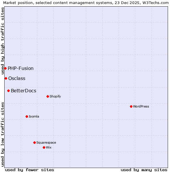 TechnologiesContent ManagementServer-side Languages Client-side Languages JavaScript Libraries CSS Frameworks Web Servers Web Panels Operating Systems Web Hosting Data Centers Reverse Proxies DNS Servers Email Servers SSL Certificate Authorities Content Delivery Traffic Analysis Tools Advertising Networks Tag Managers Social Widgets Site Elements Structured Data Markup Languages Character Encodings Image File Formats Top Level Domains Server Locations Content Languages | Technologies > Content Management > Technology usage comparison Comparison of the usage statistics of BetterDocs vs. Osclass vs. PHP-Fusion for websitesThis report shows the usage statistics of BetterDocs vs. Osclass vs. PHP-Fusion as content management system on the web. See technologies overview for explanations on the methodologies used in the surveys. Our reports are updated daily. Usage and market shareThis diagram shows the percentages of websites using the selected technologies. How to read the diagram: