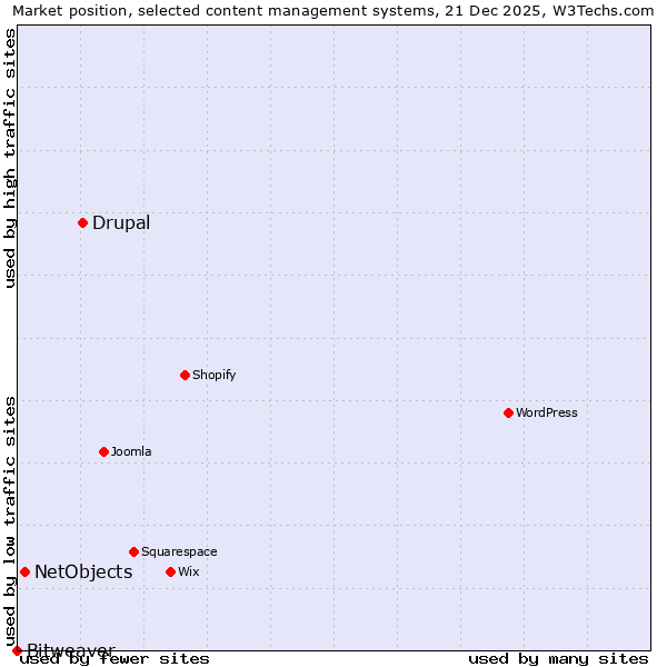 TechnologiesContent ManagementServer-side Languages Client-side Languages JavaScript Libraries CSS Frameworks Web Servers Web Panels Operating Systems Web Hosting Data Centers Reverse Proxies DNS Servers Email Servers SSL Certificate Authorities Content Delivery Traffic Analysis Tools Advertising Networks Tag Managers Social Widgets Site Elements Structured Data Markup Languages Character Encodings Image File Formats Top Level Domains Server Locations Content Languages | Technologies > Content Management > Technology usage comparison Comparison of the usage statistics of Drupal vs. NetObjects vs. Bitweaver for websitesThis report shows the usage statistics of Drupal vs. NetObjects vs. Bitweaver as content management system on the web. See technologies overview for explanations on the methodologies used in the surveys. Our reports are updated daily. Usage and market shareThis diagram shows the percentages of websites using the selected technologies. How to read the diagram: