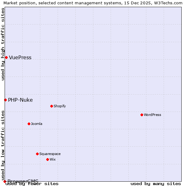 TechnologiesContent ManagementServer-side Languages Client-side Languages JavaScript Libraries CSS Frameworks Web Servers Web Panels Operating Systems Web Hosting Data Centers Reverse Proxies DNS Servers Email Servers SSL Certificate Authorities Content Delivery Traffic Analysis Tools Advertising Networks Tag Managers Social Widgets Site Elements Structured Data Markup Languages Character Encodings Image File Formats Top Level Domains Server Locations Content Languages | Technologies > Content Management > Technology usage comparison Comparison of the usage statistics of VuePress vs. PHP-Nuke vs. BrowserCMS for websitesThis report shows the usage statistics of VuePress vs. PHP-Nuke vs. BrowserCMS as content management system on the web. See technologies overview for explanations on the methodologies used in the surveys. Our reports are updated daily. Usage and market shareThis diagram shows the percentages of websites using the selected technologies. How to read the diagram: