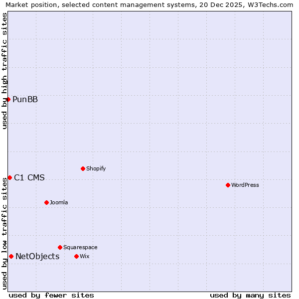 TechnologiesContent ManagementServer-side Languages Client-side Languages JavaScript Libraries CSS Frameworks Web Servers Web Panels Operating Systems Web Hosting Data Centers Reverse Proxies DNS Servers Email Servers SSL Certificate Authorities Content Delivery Traffic Analysis Tools Advertising Networks Tag Managers Social Widgets Site Elements Structured Data Markup Languages Character Encodings Image File Formats Top Level Domains Server Locations Content Languages | Technologies > Content Management > Technology usage comparison Comparison of the usage statistics of NetObjects vs. C1 CMS vs. PunBB for websitesThis report shows the usage statistics of NetObjects vs. C1 CMS vs. PunBB as content management system on the web. See technologies overview for explanations on the methodologies used in the surveys. Our reports are updated daily. Usage and market shareThis diagram shows the percentages of websites using the selected technologies. How to read the diagram: