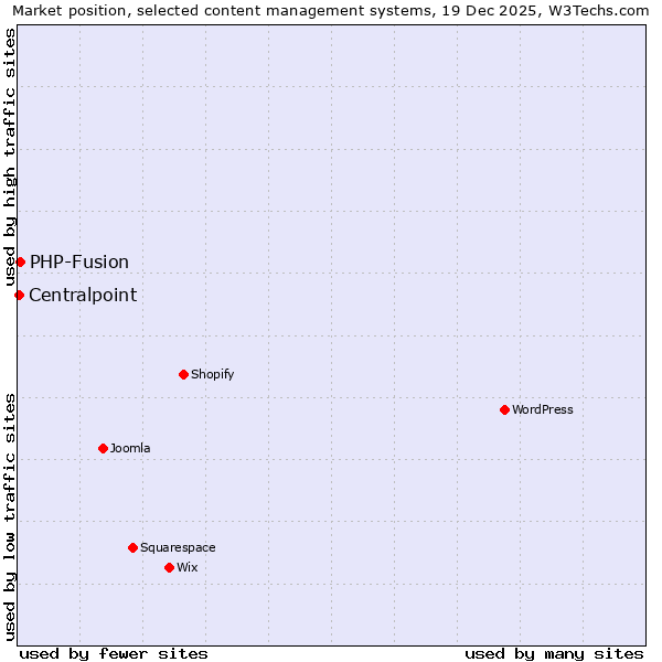 TechnologiesContent ManagementServer-side Languages Client-side Languages JavaScript Libraries CSS Frameworks Web Servers Web Panels Operating Systems Web Hosting Data Centers Reverse Proxies DNS Servers Email Servers SSL Certificate Authorities Content Delivery Traffic Analysis Tools Advertising Networks Tag Managers Social Widgets Site Elements Structured Data Markup Languages Character Encodings Image File Formats Top Level Domains Server Locations Content Languages ComparisonCompare with other | Technologies > Content Management > Technology usage comparison Comparison of the usage statistics of PHP-Fusion vs. Centralpoint for websitesThis report shows the usage statistics of PHP-Fusion vs. Centralpoint as content management system on the web. See technologies overview for explanations on the methodologies used in the surveys. Our reports are updated daily. Usage and market shareThis diagram shows the percentages of websites using the selected technologies. How to read the diagram: