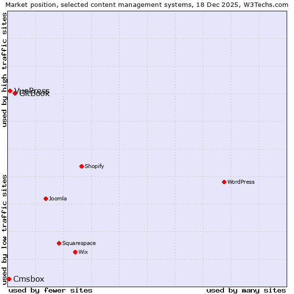 TechnologiesContent ManagementServer-side Languages Client-side Languages JavaScript Libraries CSS Frameworks Web Servers Web Panels Operating Systems Web Hosting Data Centers Reverse Proxies DNS Servers Email Servers SSL Certificate Authorities Content Delivery Traffic Analysis Tools Advertising Networks Tag Managers Social Widgets Site Elements Structured Data Markup Languages Character Encodings Image File Formats Top Level Domains Server Locations Content Languages | Technologies > Content Management > Technology usage comparison Comparison of the usage statistics of GitBook vs. VuePress vs. Cmsbox for websitesThis report shows the usage statistics of GitBook vs. VuePress vs. Cmsbox as content management system on the web. See technologies overview for explanations on the methodologies used in the surveys. Our reports are updated daily. Usage and market shareThis diagram shows the percentages of websites using the selected technologies. How to read the diagram: