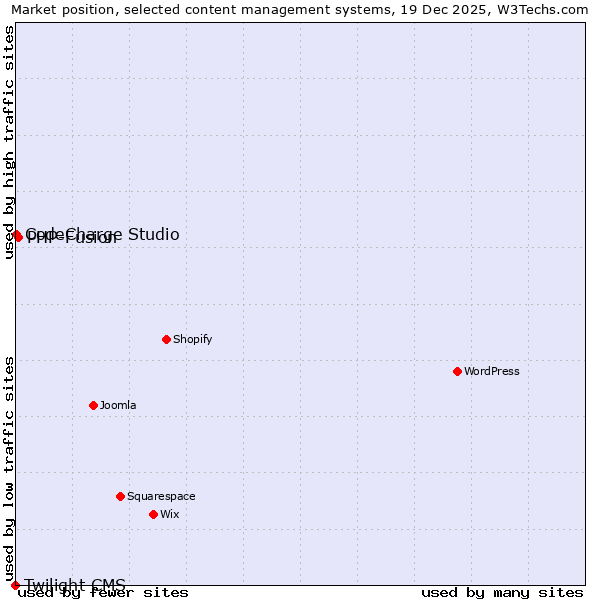 TechnologiesContent ManagementServer-side Languages Client-side Languages JavaScript Libraries CSS Frameworks Web Servers Web Panels Operating Systems Web Hosting Data Centers Reverse Proxies DNS Servers Email Servers SSL Certificate Authorities Content Delivery Traffic Analysis Tools Advertising Networks Tag Managers Social Widgets Site Elements Structured Data Markup Languages Character Encodings Image File Formats Top Level Domains Server Locations Content Languages | Technologies > Content Management > Technology usage comparison Comparison of the usage statistics of PHP-Fusion vs. CodeCharge Studio vs. Twilight CMS for websitesThis report shows the usage statistics of PHP-Fusion vs. CodeCharge Studio vs. Twilight CMS as content management system on the web. See technologies overview for explanations on the methodologies used in the surveys. Our reports are updated daily. Usage and market shareThis diagram shows the percentages of websites using the selected technologies. How to read the diagram: