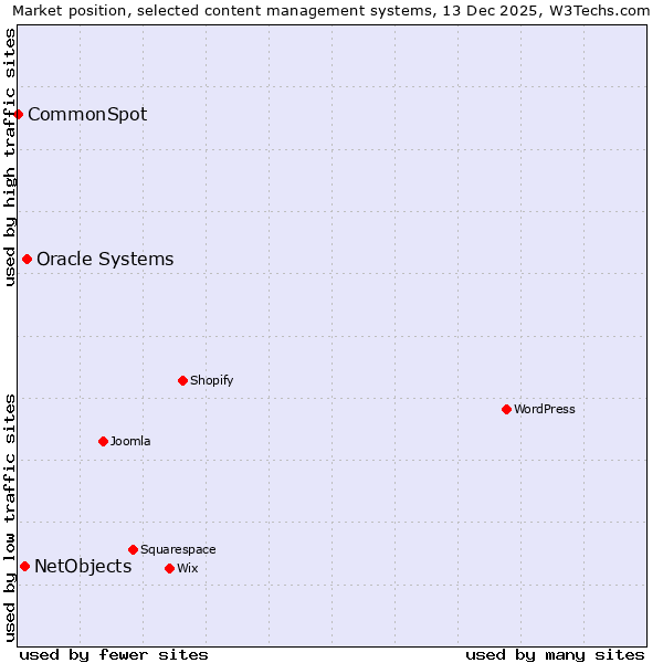 TechnologiesContent ManagementServer-side Languages Client-side Languages JavaScript Libraries CSS Frameworks Web Servers Web Panels Operating Systems Web Hosting Data Centers Reverse Proxies DNS Servers Email Servers SSL Certificate Authorities Content Delivery Traffic Analysis Tools Advertising Networks Tag Managers Social Widgets Site Elements Structured Data Markup Languages Character Encodings Image File Formats Top Level Domains Server Locations Content Languages | Technologies > Content Management > Technology usage comparison Comparison of the usage statistics of Oracle Systems vs. NetObjects vs. CommonSpot for websitesThis report shows the usage statistics of Oracle Systems vs. NetObjects vs. CommonSpot as content management system on the web. See technologies overview for explanations on the methodologies used in the surveys. Our reports are updated daily. Usage and market shareThis diagram shows the percentages of websites using the selected technologies. How to read the diagram: