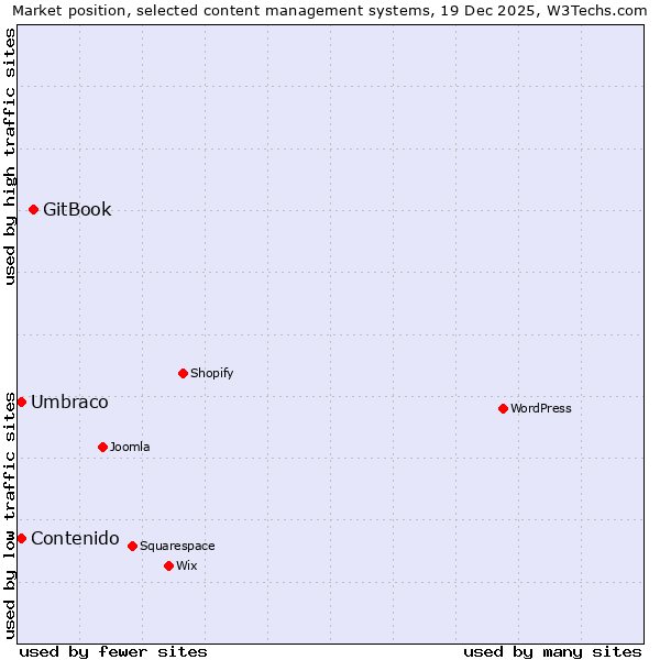 TechnologiesContent ManagementServer-side Languages Client-side Languages JavaScript Libraries CSS Frameworks Web Servers Web Panels Operating Systems Web Hosting Data Centers Reverse Proxies DNS Servers Email Servers SSL Certificate Authorities Content Delivery Traffic Analysis Tools Advertising Networks Tag Managers Social Widgets Site Elements Structured Data Markup Languages Character Encodings Image File Formats Top Level Domains Server Locations Content Languages | Technologies > Content Management > Technology usage comparison Comparison of the usage statistics of GitBook vs. Umbraco vs. Contenido for websitesThis report shows the usage statistics of GitBook vs. Umbraco vs. Contenido as content management system on the web. See technologies overview for explanations on the methodologies used in the surveys. Our reports are updated daily. Usage and market shareThis diagram shows the percentages of websites using the selected technologies. How to read the diagram: