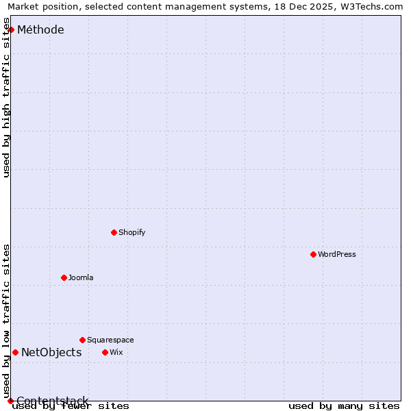 TechnologiesContent ManagementServer-side Languages Client-side Languages JavaScript Libraries CSS Frameworks Web Servers Web Panels Operating Systems Web Hosting Data Centers Reverse Proxies DNS Servers Email Servers SSL Certificate Authorities Content Delivery Traffic Analysis Tools Advertising Networks Tag Managers Social Widgets Site Elements Structured Data Markup Languages Character Encodings Image File Formats Top Level Domains Server Locations Content Languages | Technologies > Content Management > Technology usage comparison Comparison of the usage statistics of NetObjects vs. Méthode vs. Contentstack for websitesThis report shows the usage statistics of NetObjects vs. Méthode vs. Contentstack as content management system on the web. See technologies overview for explanations on the methodologies used in the surveys. Our reports are updated daily. Usage and market shareThis diagram shows the percentages of websites using the selected technologies. How to read the diagram:
