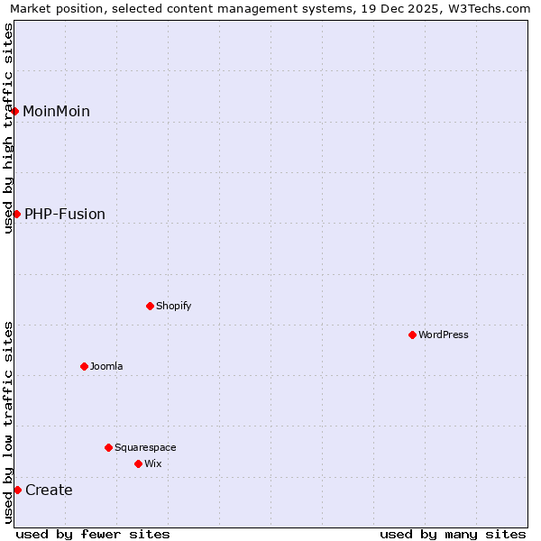 TechnologiesContent ManagementServer-side Languages Client-side Languages JavaScript Libraries CSS Frameworks Web Servers Web Panels Operating Systems Web Hosting Data Centers Reverse Proxies DNS Servers Email Servers SSL Certificate Authorities Content Delivery Traffic Analysis Tools Advertising Networks Tag Managers Social Widgets Site Elements Structured Data Markup Languages Character Encodings Image File Formats Top Level Domains Server Locations Content Languages | Technologies > Content Management > Technology usage comparison Comparison of the usage statistics of Create vs. PHP-Fusion vs. MoinMoin for websitesThis report shows the usage statistics of Create vs. PHP-Fusion vs. MoinMoin as content management system on the web. See technologies overview for explanations on the methodologies used in the surveys. Our reports are updated daily. Usage and market shareThis diagram shows the percentages of websites using the selected technologies. How to read the diagram: