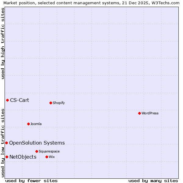 TechnologiesContent ManagementServer-side Languages Client-side Languages JavaScript Libraries CSS Frameworks Web Servers Web Panels Operating Systems Web Hosting Data Centers Reverse Proxies DNS Servers Email Servers SSL Certificate Authorities Content Delivery Traffic Analysis Tools Advertising Networks Tag Managers Social Widgets Site Elements Structured Data Markup Languages Character Encodings Image File Formats Top Level Domains Server Locations Content Languages | Technologies > Content Management > Technology usage comparison Comparison of the usage statistics of CS-Cart vs. NetObjects vs. OpenSolution Systems for websitesThis report shows the usage statistics of CS-Cart vs. NetObjects vs. OpenSolution Systems as content management system on the web. See technologies overview for explanations on the methodologies used in the surveys. Our reports are updated daily. Usage and market shareThis diagram shows the percentages of websites using the selected technologies. How to read the diagram: