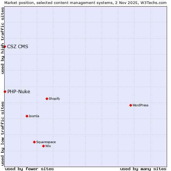 TechnologiesContent ManagementServer-side Languages Client-side Languages JavaScript Libraries CSS Frameworks Web Servers Web Panels Operating Systems Web Hosting Data Centers Reverse Proxies DNS Servers Email Servers SSL Certificate Authorities Content Delivery Traffic Analysis Tools Advertising Networks Tag Managers Social Widgets Site Elements Structured Data Markup Languages Character Encodings Image File Formats Top Level Domains Server Locations Content Languages ComparisonCompare with other | Technologies > Content Management > Technology usage comparison Comparison of the usage statistics of PHP-Nuke vs. CSZ CMS for websitesThis report shows the usage statistics of PHP-Nuke vs. CSZ CMS as content management system on the web. See technologies overview for explanations on the methodologies used in the surveys. Our reports are updated daily. Usage and market shareThis diagram shows the percentages of websites using the selected technologies. How to read the diagram: