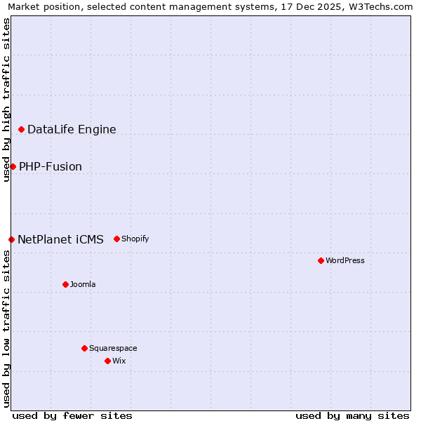 TechnologiesContent ManagementServer-side Languages Client-side Languages JavaScript Libraries CSS Frameworks Web Servers Web Panels Operating Systems Web Hosting Data Centers Reverse Proxies DNS Servers Email Servers SSL Certificate Authorities Content Delivery Traffic Analysis Tools Advertising Networks Tag Managers Social Widgets Site Elements Structured Data Markup Languages Character Encodings Image File Formats Top Level Domains Server Locations Content Languages | Technologies > Content Management > Technology usage comparison Comparison of the usage statistics of DataLife Engine vs. PHP-Fusion vs. NetPlanet iCMS for websitesThis report shows the usage statistics of DataLife Engine vs. PHP-Fusion vs. NetPlanet iCMS as content management system on the web. See technologies overview for explanations on the methodologies used in the surveys. Our reports are updated daily. Usage and market shareThis diagram shows the percentages of websites using the selected technologies. How to read the diagram: