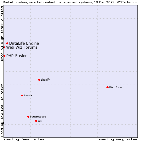 TechnologiesContent ManagementServer-side Languages Client-side Languages JavaScript Libraries CSS Frameworks Web Servers Web Panels Operating Systems Web Hosting Data Centers Reverse Proxies DNS Servers Email Servers SSL Certificate Authorities Content Delivery Traffic Analysis Tools Advertising Networks Tag Managers Social Widgets Site Elements Structured Data Markup Languages Character Encodings Image File Formats Top Level Domains Server Locations Content Languages | Technologies > Content Management > Technology usage comparison Comparison of the usage statistics of DataLife Engine vs. PHP-Fusion vs. Web Wiz Forums for websitesThis report shows the usage statistics of DataLife Engine vs. PHP-Fusion vs. Web Wiz Forums as content management system on the web. See technologies overview for explanations on the methodologies used in the surveys. Our reports are updated daily. Usage and market shareThis diagram shows the percentages of websites using the selected technologies. How to read the diagram: